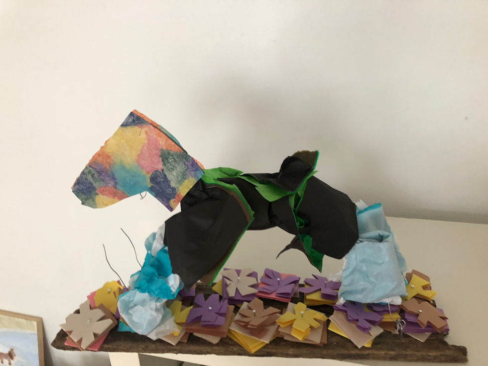 Paper, wood, wire hanger.